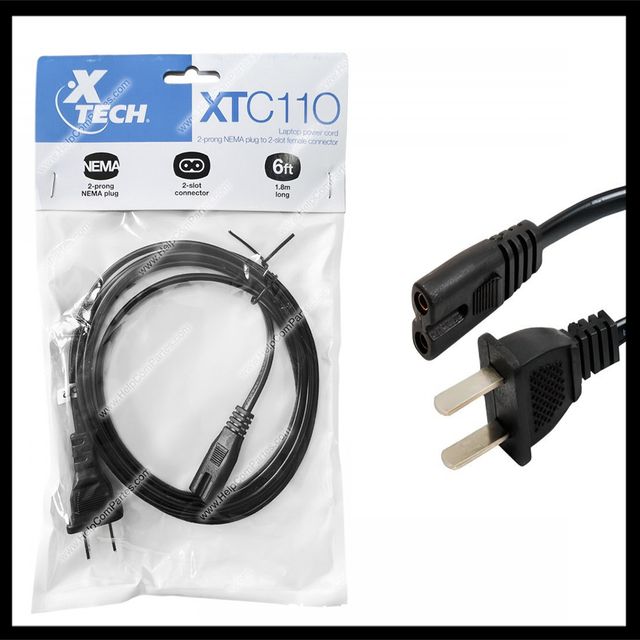 XTECH XTC-110 Cable de Alimentación 2 Pines para Laptop 1.8m Negro, Ideal como cable de repuesto para computadoras portátiles y otros dispositivos compatibles., Enchufes moldeados para mayor durabilidad., Elaborado con materiales de calidad.