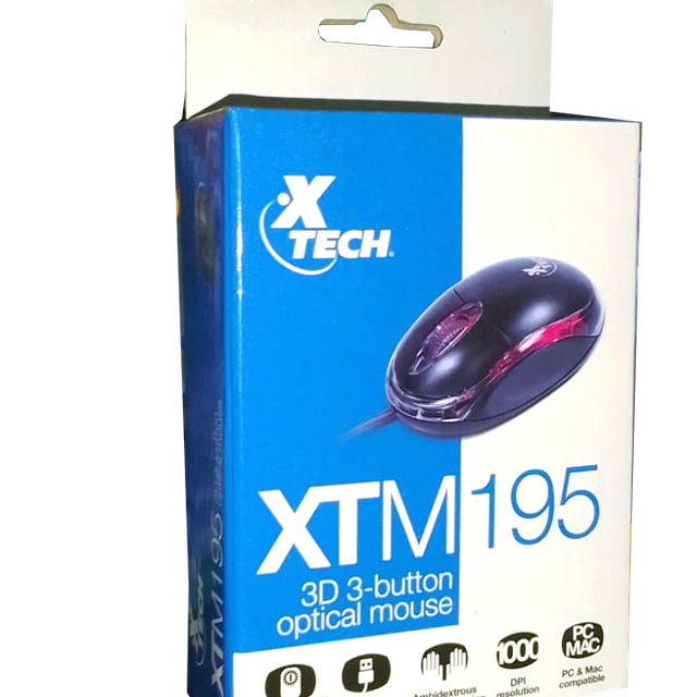 Mouse Basico XTM-195 marca Xtech cuenta con 1.35 mts de longitud de cable, el modo de conexion es USB.